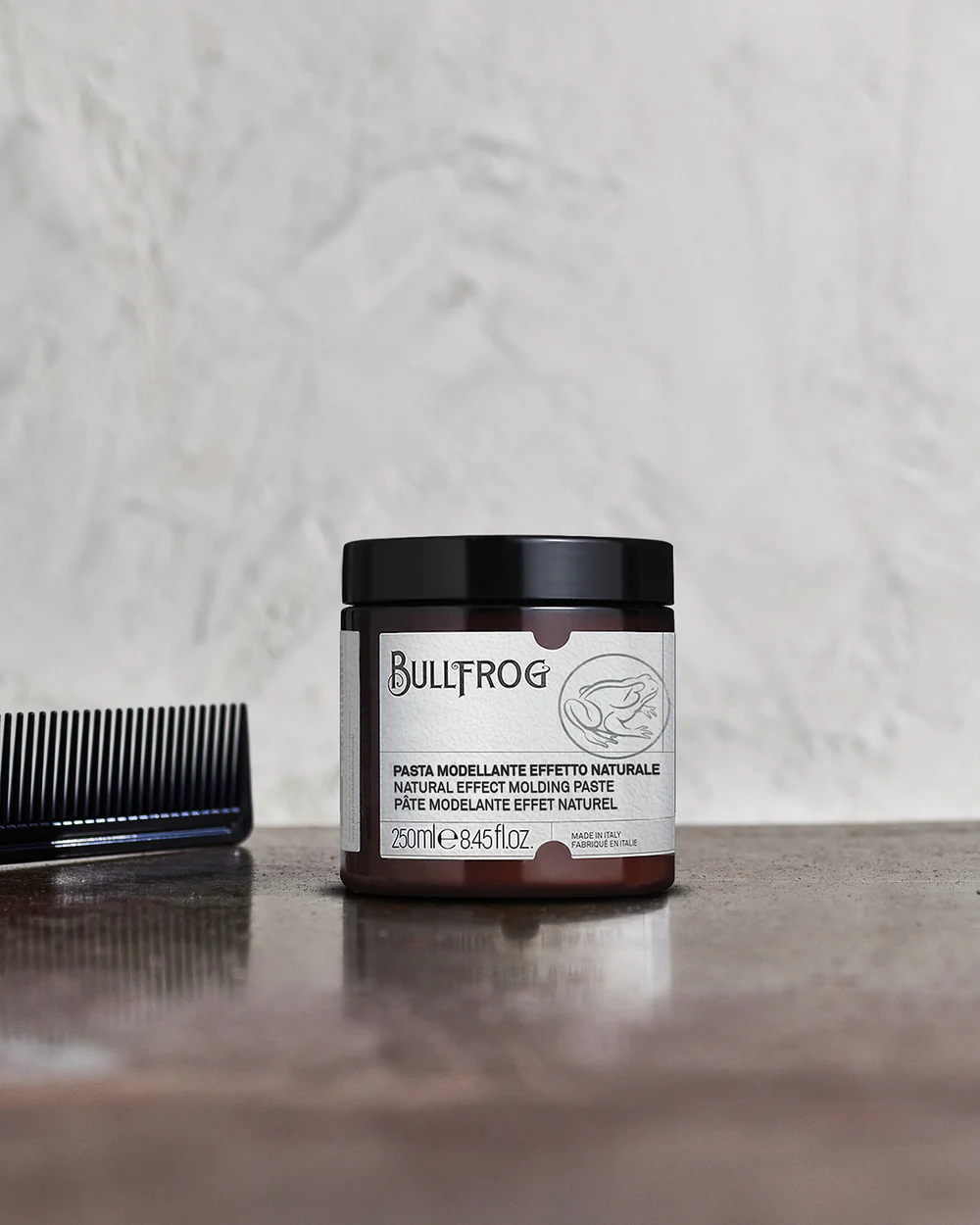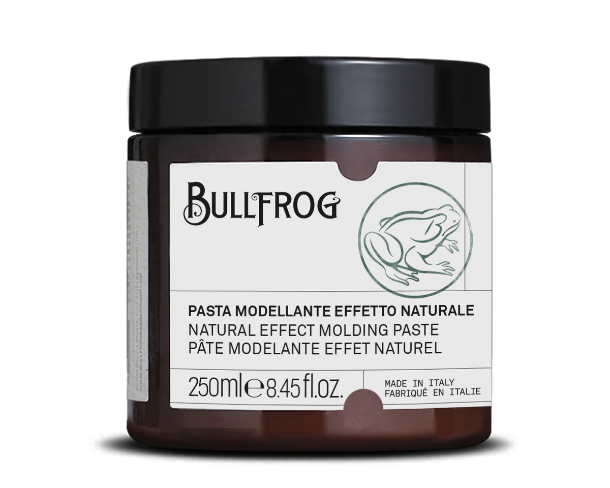 Bullfrog Natural Effect Molding Paste, to matowa pasta do włosów na bazie wody. Produkt oferuje chwyt na poziomie średnio mocnym, dodatkowo zapewnia matowe wykończenie. Produkt idealny dla osób, które posiadają włosy skłonne do obciążenia, dzięki swojej delikatniej formule, nie obciąża włosów. Idealnie sprawdzi się przy wszelkich fryzurach, które wymagają lekkości i tekstury. Produkt nie skleja włosów. Zapach pasty marki Bullfrog to delikatne piżmo.