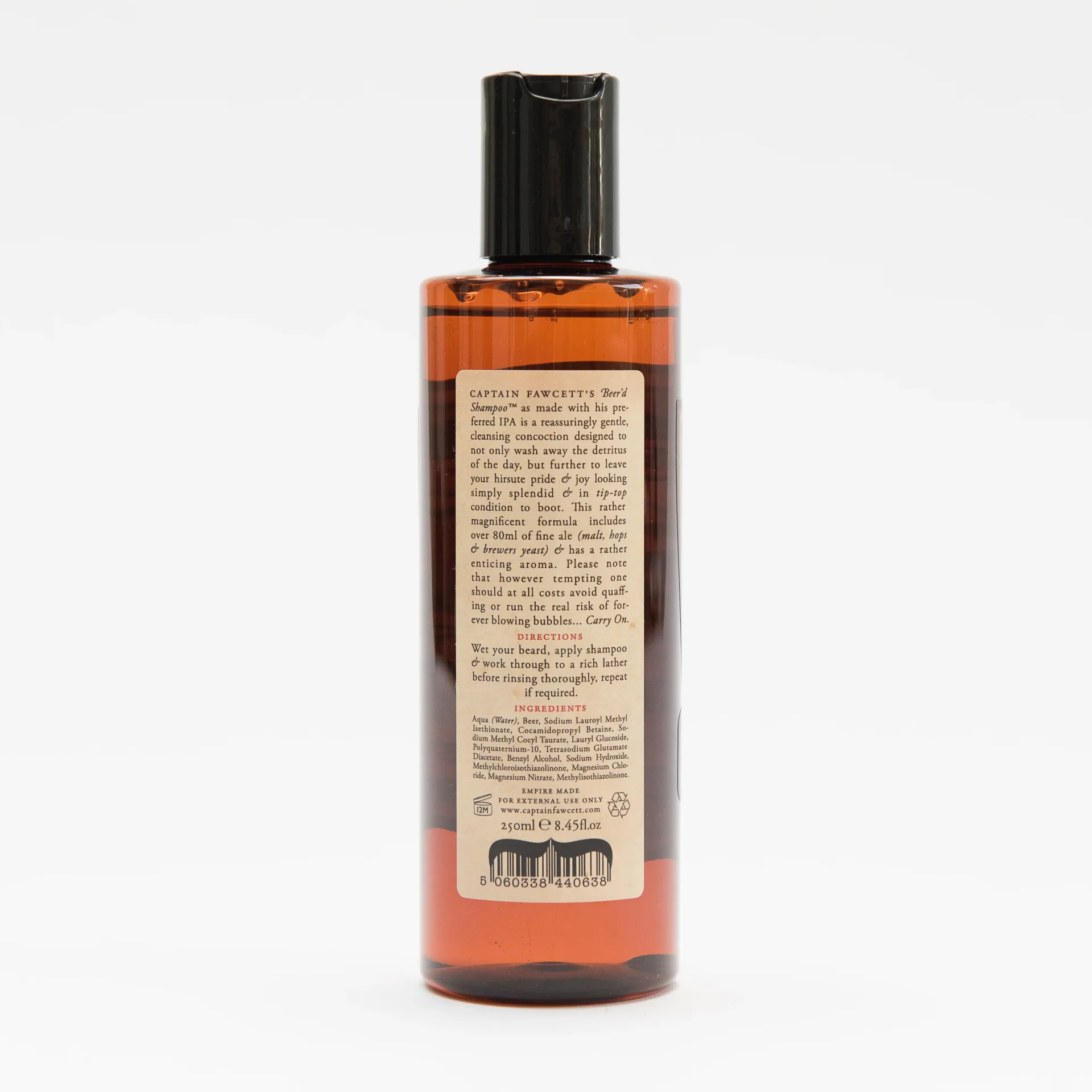 Captain Fawcett’s Beer’d Shampoo® to wielokrotnie nagradzany szampon do brody, który zapewnia głębokie oczyszczenie i wyjątkową pielęgnację, pozostawiając zarost czysty, odżywiony i pełen naturalnego blasku. Dzięki swojej łagodnej, a jednocześnie skutecznej formule, szampon ten doskonale usuwa zanieczyszczenia, jednocześnie dbając o kondycję i wygląd brody.
