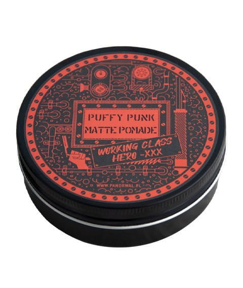 Puffy Punk to matowe mazidło do włosów, którego nie nazywamy pastą. Chowamy je w czarnej, metalowej puszce. To średniochwytliwa pomada do fryzur nowoczesnych, którą ułożysz także gładkie fryzury tradycyjne. Pomada została napowietrzona dzięki produkcji z wykorzystaniem dwuczęściowego mieszadła wolnoobrotowego. Dzięki temu podnosi włosy i zachowuje się tak, że nie widać produktu na włosach, a trzyma je w ryzach wzorowo. Stąd jego nazwa Puffy czyli Ptysio! Łatwa aplikacja i łatwa zmywalność z włosów i rąk. Puffy ma zabójczy, mandarynkowo – koloński zapach, bo w serii Working Class Hero zapachy fabryki, smaru i punk rocka zmieszają się z tak trudno dostępnymi za komuny cytrusami. Mandarynka to owoc dla zapracowanego człowieka – jest szybki w obierce, zgrabny do paszczy i sprawia wrażenie kulturalnych doznań.