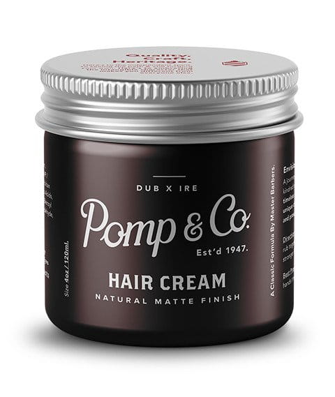 Pomp & Co. Hair Cream, to produkt na bazie wody. Oferuje średni chwyt oraz matowe wykończenie. Produkt charakteryzuje bardzo łatwą aplikacją i doskonałą teksturą. Krem zawiera wosk pszczeli, wazelinę i cerezynę, przez co gwarantuje doskonałe utrwalenie fryzury o różnej długości. Dzięki glince porcelanowej (kaolin) włosy mają zapewnioną ochronę przed nadmierną łamliwością i wypadaniem. Białka keratyny w połączeniu z lanoliną sprawiają, że uszkodzona struktura włosów pozostaje odbudowana i zyskuje elastyczność. Zapach kremu to świeże nuty wody kolońskiej.